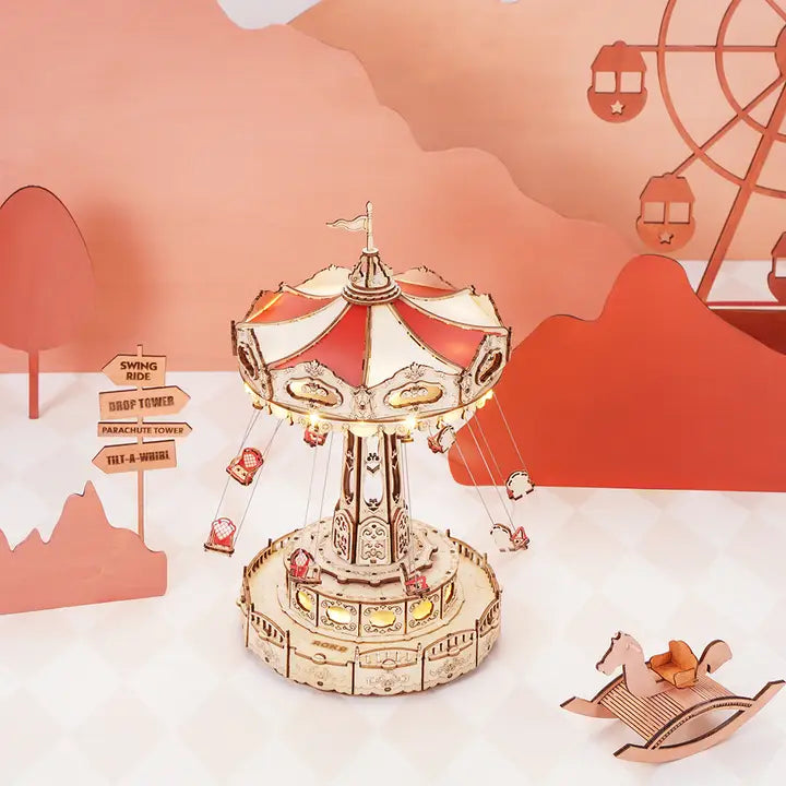 Swing Ride DIY music box is a creative and fun-to-play wooden 3D puzzle kit of Magic Amusement Park Series. Its design is inspired by the swing ride in the amusement park. With built-in movement, the seats will be suspended from the rotating top of the carousel with music and lights on by simply touching the button. Build this exquisite 3D wooden puzzle with your hands and enjoy the ride!