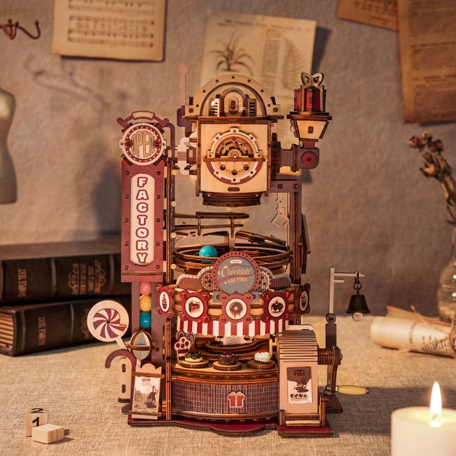 Build a 3D wooden puzzle kit without the help of Oompa-Loompas! This simulated mechanical candy production line is actually a 420-piece automated marble run. Simply shake the handle and the colorful candy marbles will begin their journey down different slopes and turns. Watch as the LED signboard illuminates this puzzle as the mechanical gears deliver your candy to the working chef!